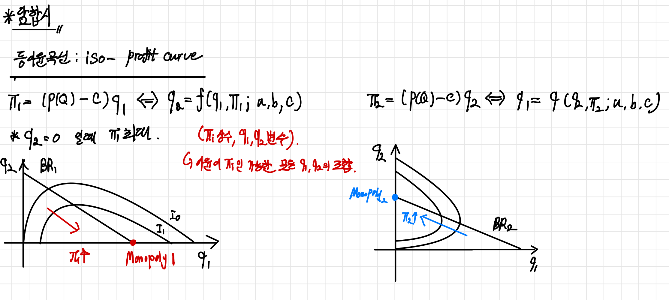 - 등이윤곡선: 각 기업에게 동일한 이윤을 주는 생산량 조합$(q_1,q_2)$점을 선으로 이은 곡선