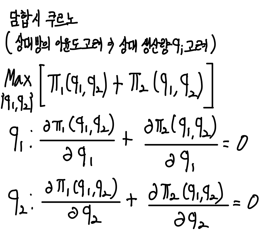 결과적으로 각 기업은 생산량을 줄임으로서 최대의 이윤을 얻게 된다.
