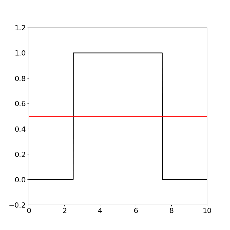 import numpy as np import matplotlib.pyplot as plt from matplotlib import animation, rc from IPython.display import HTML plt.rcParams['figure.figsize'] = [8, 8] plt.rcParams.update({'font.size': 18}) plt.rcParams['animation.html'] = 'jshtml' dx = 0.01 L = 10 x = np.arange(0,L+dx,dx) n = len(x) nquart = int(np.floor(n/4)) f = np.zeros_like(x) f[nquart:3*nquart] = 1 A0 = np.sum(f * np.ones_like(x)) * dx * 2 / L fFS = A0/2 * np.ones_like(f) fig,ax = plt.subplots() plt.plot(x,f,color='k',linewidth=2) fFS_plot, = plt.plot([],[],color='r',linewidth=2) all_fFS = np.zeros((len(fFS),101)) all_fFS[:,0] = fFS for k in range(1,101): Ak = np.sum(f * np.cos(2*np.pi*k*x/L)) * dx * 2 / L Bk = np.sum(f * np.sin(2*np.pi*k*x/L)) * dx * 2 / L fFS = fFS + Ak*np.cos(2*k*np.pi*x/L) + Bk*np.sin(2*k*np.pi*x/L) all_fFS[:,k] = fFS def init(): ax.set_xlim(x[0],x[-1]) ax.set_ylim(-0.2, 1.2) return fFS def animate(iter): fFS_plot.set_data(x,all_fFS[:,iter]) return fFS_plot anim = animation.FuncAnimation(fig,animate,init_func=init,frames=101,interval=50,blit=False,repeat=False) HTML(anim.to_jshtml())