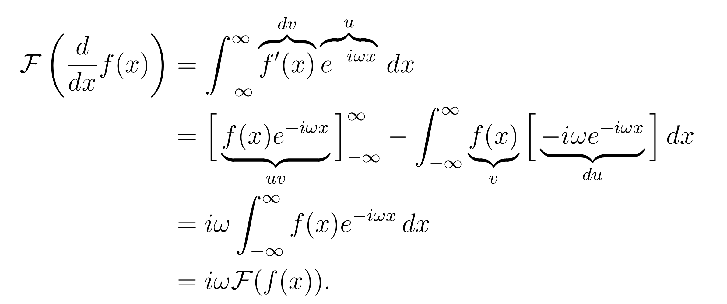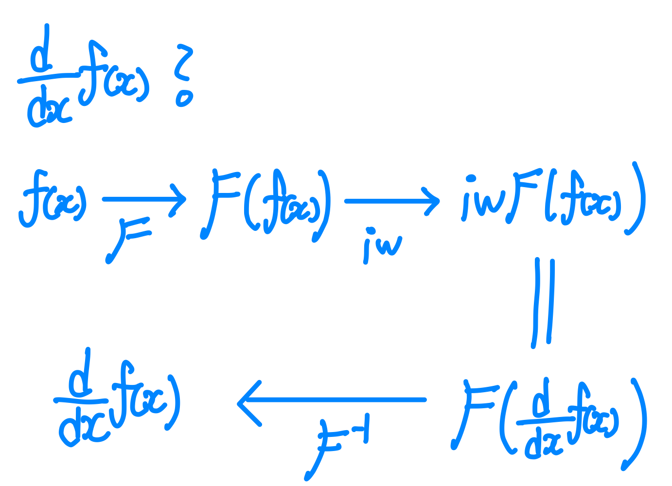 함수 $f'(x)$의 푸리에 변환은 함수 $f(x)$를 먼저 푸리에 변환한 뒤 $iw$ 항을 곱해줌으로서 얻을 수 있다.