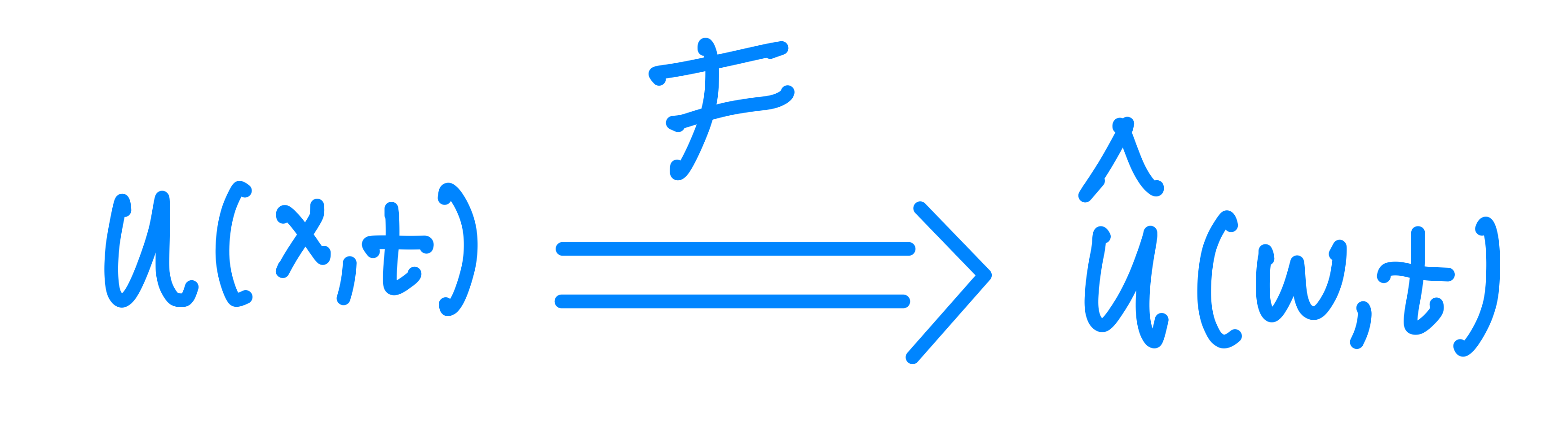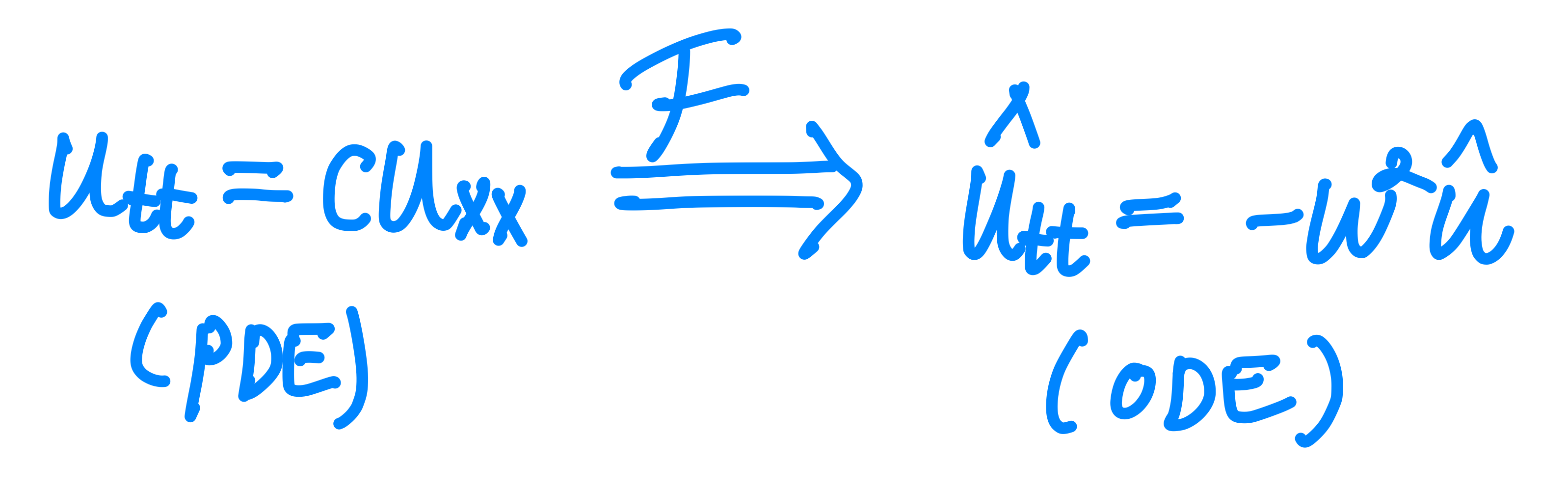 이때 푸리에 변환에서의 미분의 특징을 이용하여 공간에 대하여 푸리에 변환을 하게 되면 시간에 대한 상미분 방정식으로 바뀌어