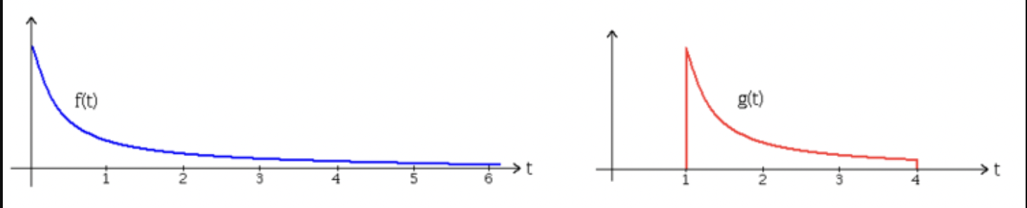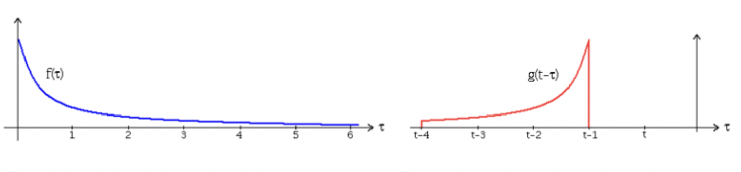 이 함수들을 시간에 대한 입력이라고 생각하면 $f(t)$의 경우에는 0초부터 입력이 시작되며 $g(t)$는 그로부터 1초 뒤 부터 입력이 시작된다.