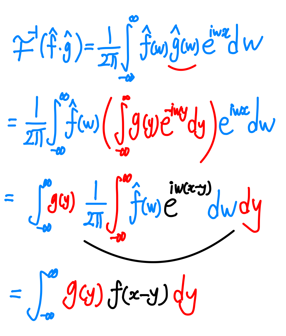 이를 이용해서 각각 푸리에 변환된 $f$와 $g$의 곱을 푸리에 역변환하면 다음과 같다.