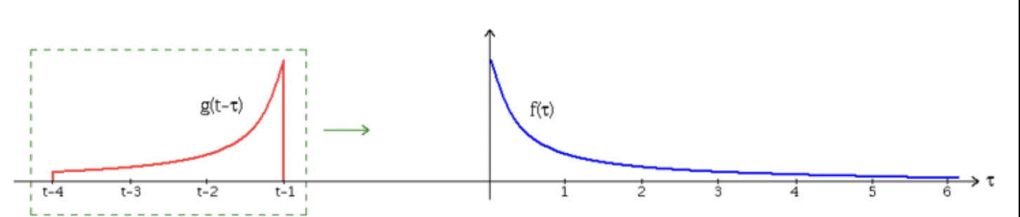합성곱 연산은 두 함수 f, g 가운데 하나의 함수를 반전(reverse), 전이(shift)시킨 다음, 다른 하나의 함수와 곱한 결과를 적분하는 것을 의미한다. 위의 경우에는 함수 $g$를 반전후 전이시킨 경우이다.