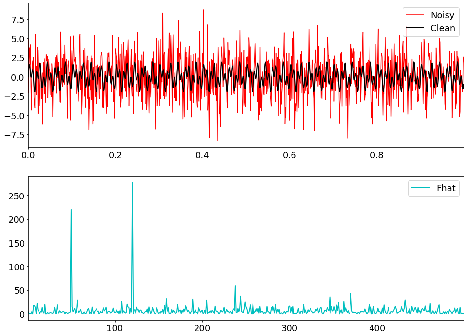 import numpy as np import matplotlib.pyplot as plt plt.rcParams['figure.figsize'] = [16, 12] plt.rcParams.update({'font.size': 18}) # 데이터간의 간격과 정의역 정의 dt = 0.001 # 각 데이터를 sampling 하는 간격 t = np.arange(0,1,dt) # 전체 데이터가 나타난 정의역 # 잡음이 없을 때의 신호의 파형 f = np.sin(2*np.pi*50*t) + np.sin(2*np.pi*120*t) # 진동수 50과 120을 갖는 파형이 합쳐져 만든 원래 신호 f_clean = f # 원래신호를 clean 함수로 변수를 변경해두고 # 원래 신호에 noise 추가 f = f + 2.5*np.random.randn(len(t)) # t개의 원래 데이터점 f(t)에 대해서 임의의 값을 2.5배 스케일링하여 더한다. plt.plot(t,f,color='c',linewidth=1.5,label='Nosiy') plt.plot(t,f_clean,color='k',linewidth=2,label='Clean') plt.xlim(t[0],t[-1]) plt.legend()