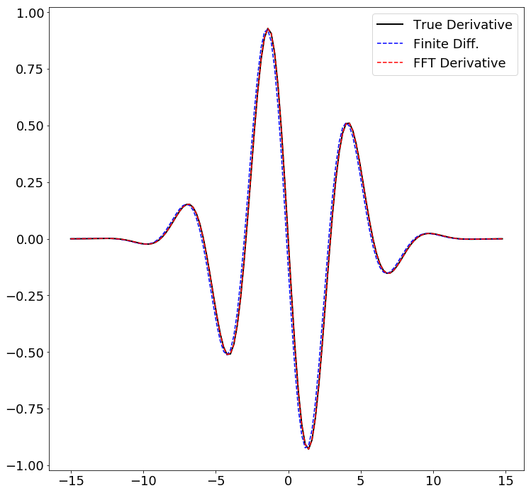 plt.plot(x,df.real,color='k',linewidth=2,label='True Derivative') plt.plot(x,dfFD.real,'--',color='b',linewidth=1.5,label='Finite Diff.') plt.plot(x,dfFFT.real,'--',color='r',linewidth=1.5,label='FFT Derivative') plt.legend() plt.show()