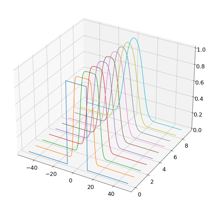 import numpy as np import matplotlib.pyplot as plt from scipy.integrate import odeint from mpl_toolkits.mplot3d import axes3d plt.rcParams['figure.figsize'] = [12, 12] plt.rcParams.update({'font.size': 18}) # 열미분방정식(1D)풀이 # 각 위치에서 온도가 주어졌을 때 시간이 지남에 따라 각 위치에서 온도가 어떻게 변화하는가? # 방정식의 해 => u(x,t) = ? (시간과 위치를 해에 대입하면 해당 시간과 위치에서의 온도가 나온다.) # 정의역 설정(x) a = 1 # 열전도율 L = 100 # 주기 N = 1000 # 주기내에 이산적으로 나타날 데이터점 개수 dx = L/N # 각 데이터간의 간격 x = np.arange(-L/2,L/2,dx) # 정의역 설정 # 이산데이터에 대한 wavenumbers 정의 kappa = 2*np.pi*np.fft.fftfreq(N, d=dx) # 초기상태의 열분포 (모자모양) u0 = np.zeros_like(x) u0[int((L/2 - L/10)/dx):int((L/2 + L/10)/dx)] = 1 u0hat = np.fft.fft(u0) # SciPy의 odeint 함수는 복소수에서의 계산이 어려우므로 N개의 복소수 벡터를 2N개의 실수 벡터로 다룬다. u0hat_ri = np.concatenate((u0hat.real,u0hat.imag)) # 정의역 설정(t) dt = 0.1 t = np.arange(0,10,dt) # 위에서 주어진 시간 t, wavenumber kappa, 열전도율 a, 공간에 대한 푸리에 변환값을 이용 # 푸리에 변환된 열방정식을 구성하는 함수 def rhsHeat(uhat_ri,t,kappa,a): uhat = uhat_ri[:N] + (1j) * uhat_ri[N:] d_uhat = -a**2 * (np.power(kappa,2)) * uhat d_uhat_ri = np.concatenate((d_uhat.real,d_uhat.imag)).astype('float64') return d_uhat_ri # 푸리에 변환된 방정식 적분하여 해를 구함 uhat_ri = odeint(rhsHeat, u0hat_ri, t, args=(kappa,a)) uhat = uhat_ri[:,:N] + (1j) * uhat_ri[:,N:] u = np.zeros_like(uhat) # 구한 해를 푸리에 역변환하여 원래의 x,t좌표에서 나타냄 for k in range(len(t)): u[k,:] = np.fft.ifft(uhat[k,:]) u = u.real # 구한 해를 3d로 plot fig = plt.figure() ax = fig.add_subplot(111, projection='3d') u_plot = u[0:-1:10,:] for j in range(u_plot.shape[0]): ys = j*np.ones(u_plot.shape[1]) ax.plot(x,ys,u_plot[j,:]) # 구한 해를 이미지로 plot plt.figure() plt.imshow(np.flipud(u), aspect=8) plt.axis('off') plt.show()