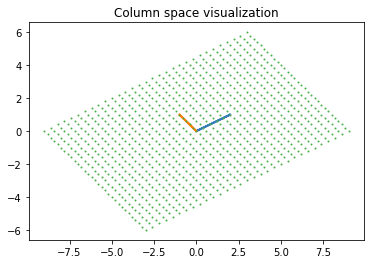 ## 두 열벡터의 선형 결합으로 나타날 수 있는 열 공간 나타내기 v1 = np.array([2, 1]) # 시스템을 구성하는 열벡터 1 v2 = np.array([-1, 1]) # 시스템을 구성하는 열벡터 2 a = np.column_stack((v1, v2)) # 열벡터 1,2의 선형 결합으로 나타나는 열공간 a ## 열 공간 나타내는 범위 (min,max,num) xvals = np.linspace(-3, 3, 31) yvals = np.linspace(-3, 3, 31) # 입력이될 grid 만들기 grid = np.column_stack([[x, y] for x in xvals for y in yvals]) # 열공간과 grid 선형변환 lc = np.dot(a, grid) # 열 벡터 선형결합으로 열공간 나타내기 plt.clf() plt.plot(lc[0], lc[1], ".", color="#4daf4a", ms=2) plt.arrow(0, 0, v1[0], v1[1], color="#377eb8", lw=2) plt.arrow(0, 0, v2[0], v2[1], color="#ff7f00", lw=2) plt.title("Column space visualization")