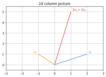 ## 열관점에서 보기 # 행렬 A를 두개의 열벡터의 묶음으로 보면 v1 = np.array([2, 1]) ## 첫번째 열벡터 (2,1) v2 = np.array([-1, 1]) ## 두번째 열벡터 (-1,1) lc = 2*v1 + 3*v2 ## 벡터 b -> 두 열벡터의 선형결합을 통해 벡터 b를 얻기 위해서 (x,y)는 (2,3) # 각 열벡터와 열벡터의 선형 결합 결과 그리기 plt.clf() # 시점(0,0),배열 첫번째 원소-(벡터의 x축 방향 값),배열 두번째 원소-(벡터의 y축 방향 값) plt.arrow(0, 0, v1[0], v1[1], color="#377eb8") plt.arrow(0, 0, v2[0], v2[1], color="#ff7f00") plt.arrow(0, 0, lc[0], lc[1], color="#e41a1c") # figure이름과 좌표축 이름 설정하기 plt.title("2d column picture") plt.text(2.1, 1.1, r"$v_1$", color="#377eb8") plt.text(-1.3, 1.1, r"$v_2$", color="#ff7f00") plt.text(1.1, 5.1, r"$2 v_1 + 3 v_2$", color="#e41a1c") plt.xlim((-3, 3)) plt.ylim((-0.5, 5.5)) plt.grid(True)