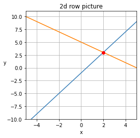 ## 행관점에서 보기 # 2x - y = 1 # x + y = 5 ## 방정식 구성하기 x = np.array([-5, 5]) # x축 범위는 -5 부터 5까지이며 # 해당 범위에서 y1과 y2는 다음과 같이 나타낸다. y1 = 2*x - 1 y2 = 5 - x ## 직선의 방정식 그리기 plt.figure(figsize=(4, 4), facecolor="w") # figure 크기와 색 설정 plt.plot(x, y1, x, y2) # figure상에 직선의 방정식 그리기 # 교점 나타내기 plt.plot(2, 3, "ro", mec="r") plt.title("2d row picture") # 그래프 제목 ## 좌표축 이름 붙이기 plt.xlabel("x") plt.ylabel("y", rotation=0) plt.xlim(x) # x축범위 plt.ylim(ymin=-10) # y축 범위 plt.grid(True) # 눈금 나타내기