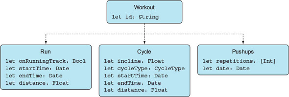 상속의 장점을 살리지 못하면서도 상속을 쓸바에는 Enum을 사용하여 상위개념으로 그룹하하고 밑의 case로서 개별 운동을 추가하는 것이 더 효과적일 것이다. 왜냐하면 이후 새로운 유형의 운동을 모델링할 때 상속 속성을 고려할 필요없이 온전히 해당 운동에 필요한 속성들만을 넣고도 여전히 계층화는 가능하기 때문이다.enum Workout { case run(Run) case cycle(Cycle) case pushups(Pushups) }let pushups = Pushups(repetitions: [22,20,10], date: Date()) let workout = Workout.pushups(pushups)switch workout { case .run(let run): print("Run: \(run)") case .cycle(let cycle): print("Cycle: \(cycle)") case .pushups(let pushups): print("Pushups: \(pushups)") }enum Workout { case run(Run) case cycle(Cycle) case pushups(Pushups) case abs(Abs)모델간의 계층을 나눌 필요가 있을 때 , 그룹을 지을 필요가 있을 때