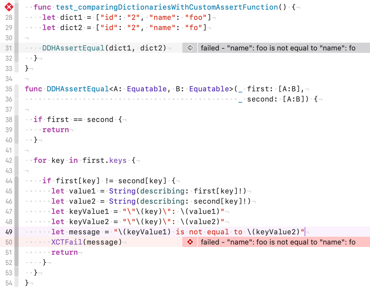 func DDHAssertEqual<A: Equatable, B: Equatable>( _ first: [A:B], _ second: [A:B], file: StaticString = #filePath, // << new line: UInt = #line) { // << new if first == second { return } for key in first.keys { if first[key] != second[key] { let value1 = String(describing: first[key]!) let value2 = String(describing: second[key]!) let keyValue1 = "\"\(key)\": \(value1)" let keyValue2 = "\"\(key)\": \(value2)" let message = "\(keyValue1) is not equal to \(keyValue2)" XCTFail(message, file: file, line: line) // << new return } } }- file과 line 파라미터를 새로 추가하였으며 file의 기본값은 # filePath, # line 이다.