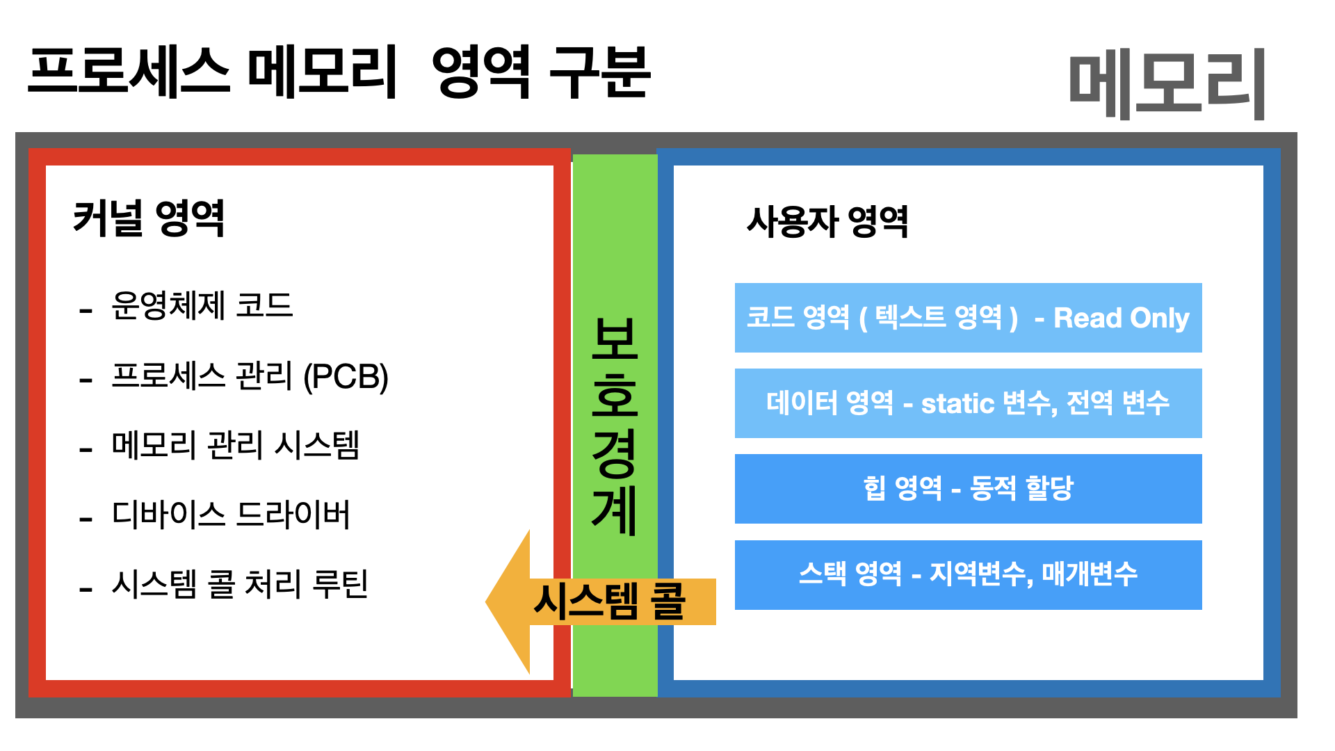 프로세스의 메모리는 커널 영역과 사용자 영역으로 구분되며, 두 영역 사이에는 보호 경계(Protection Boundary)가 있습니다. 이 보호 경계는 사용자 프로그램이 운영체제의 핵심 부분에 직접 접근하는 것을 차단하는 보안 장치로, 사용자 프로그램은 커널의 기능이 필요할 때 반드시 시스템 콜이라는 정해진 인터페이스를 통해 요청해야 합니다.