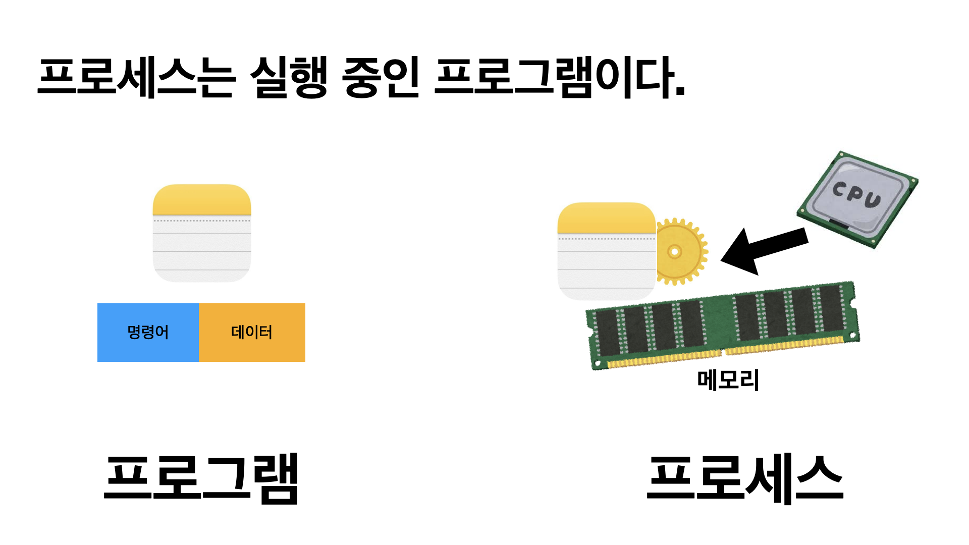 반면 프로세스는 실행 중인 프로그램을 의미합니다. 프로그램이 실행되면 운영체제는 해당 프로그램을 메모리에 로드하고, CPU 시간과 같은 시스템 자원을 할당합니다. 이렇게 실행되어 메모리에서 동작하는 상태가 바로 프로세스입니다.
