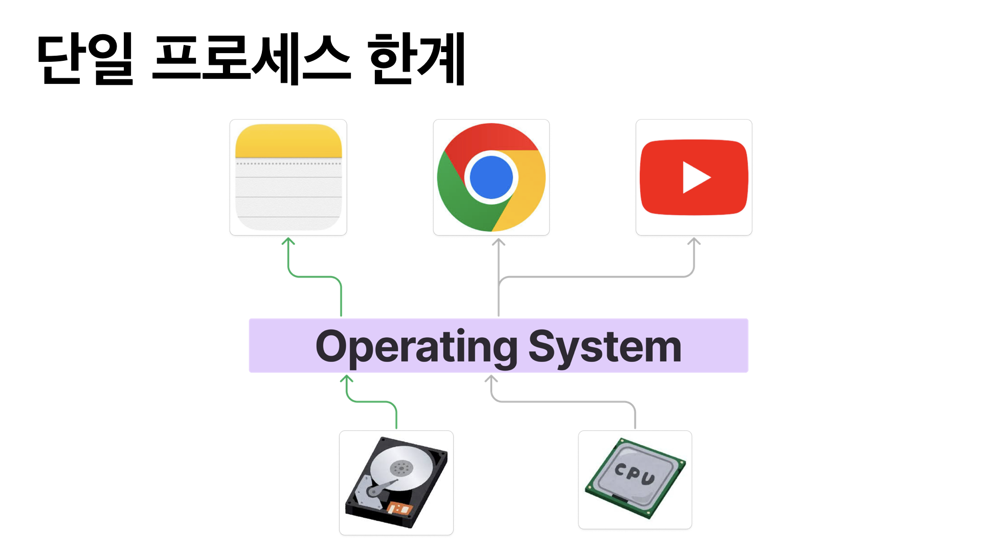 프로세스의 도입으로 하나의 CPU 코어를 여러 프로그램이 시분할(time-sharing) 방식으로 공유할 수 있게 되었습니다.