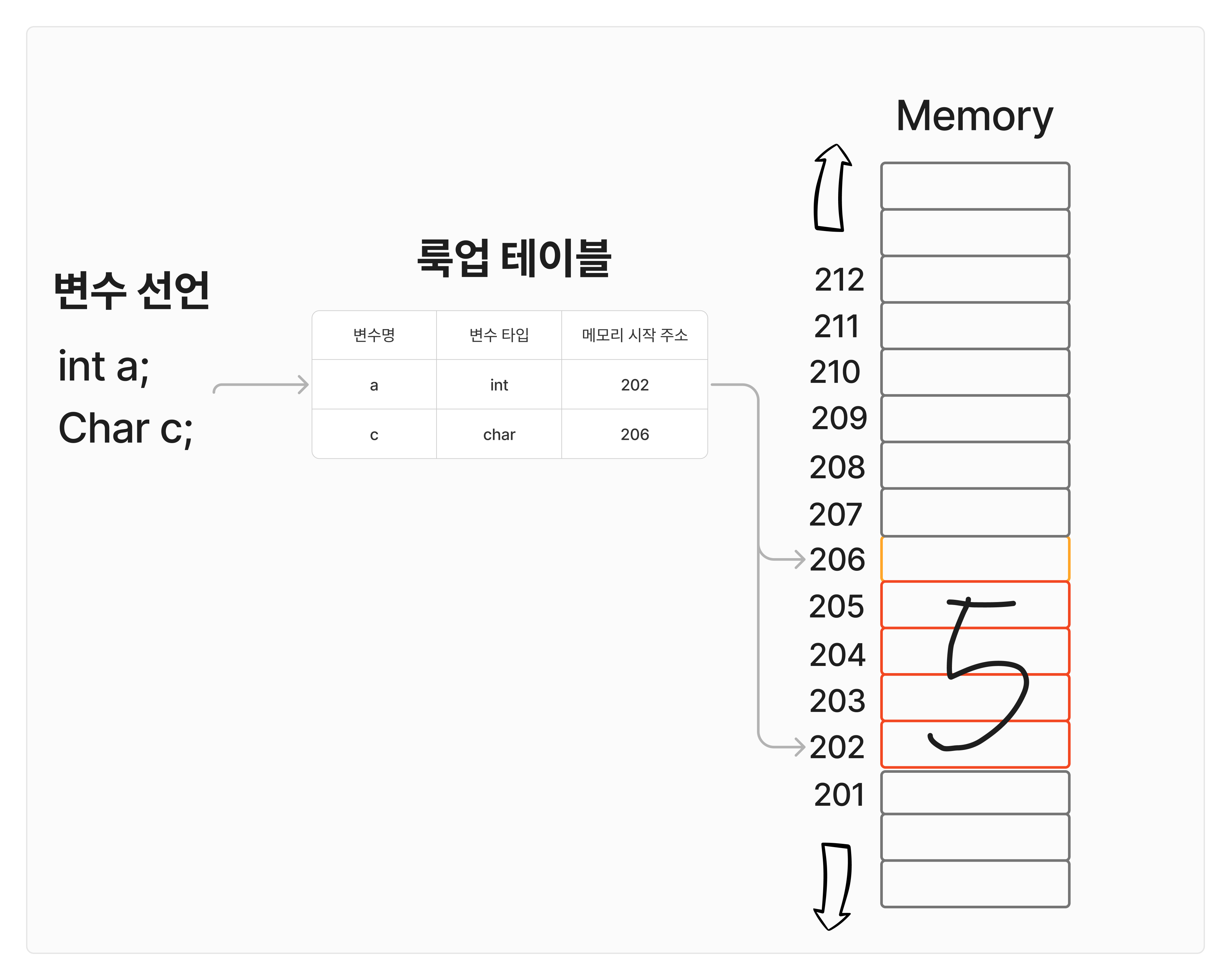 시스템 내부적으로 룩업 테이블이라는 것을 가지고 있으며 해당 테이블에는 변수명, 변수 타입, 메모리 시작 주소를 가지고 있다.