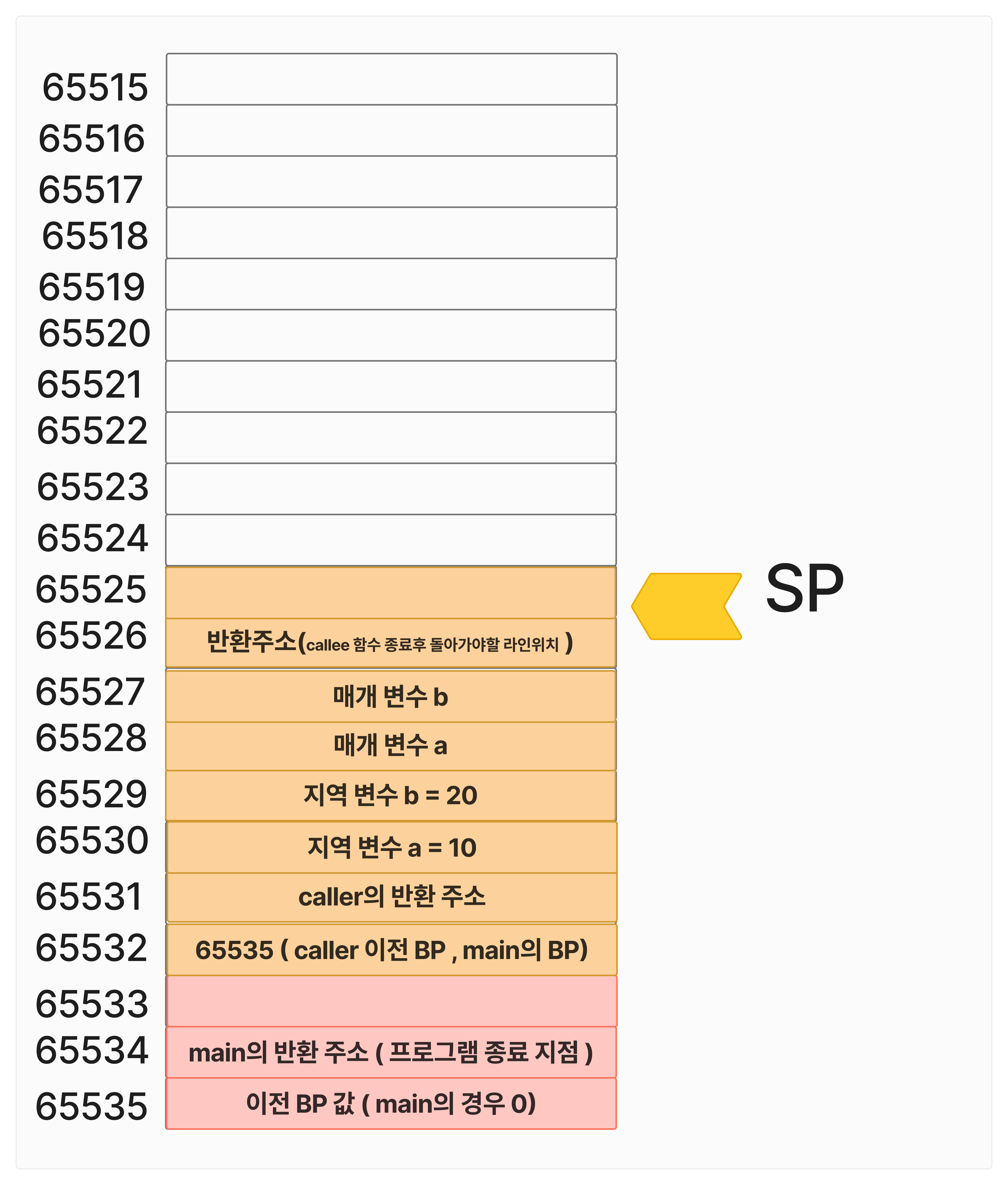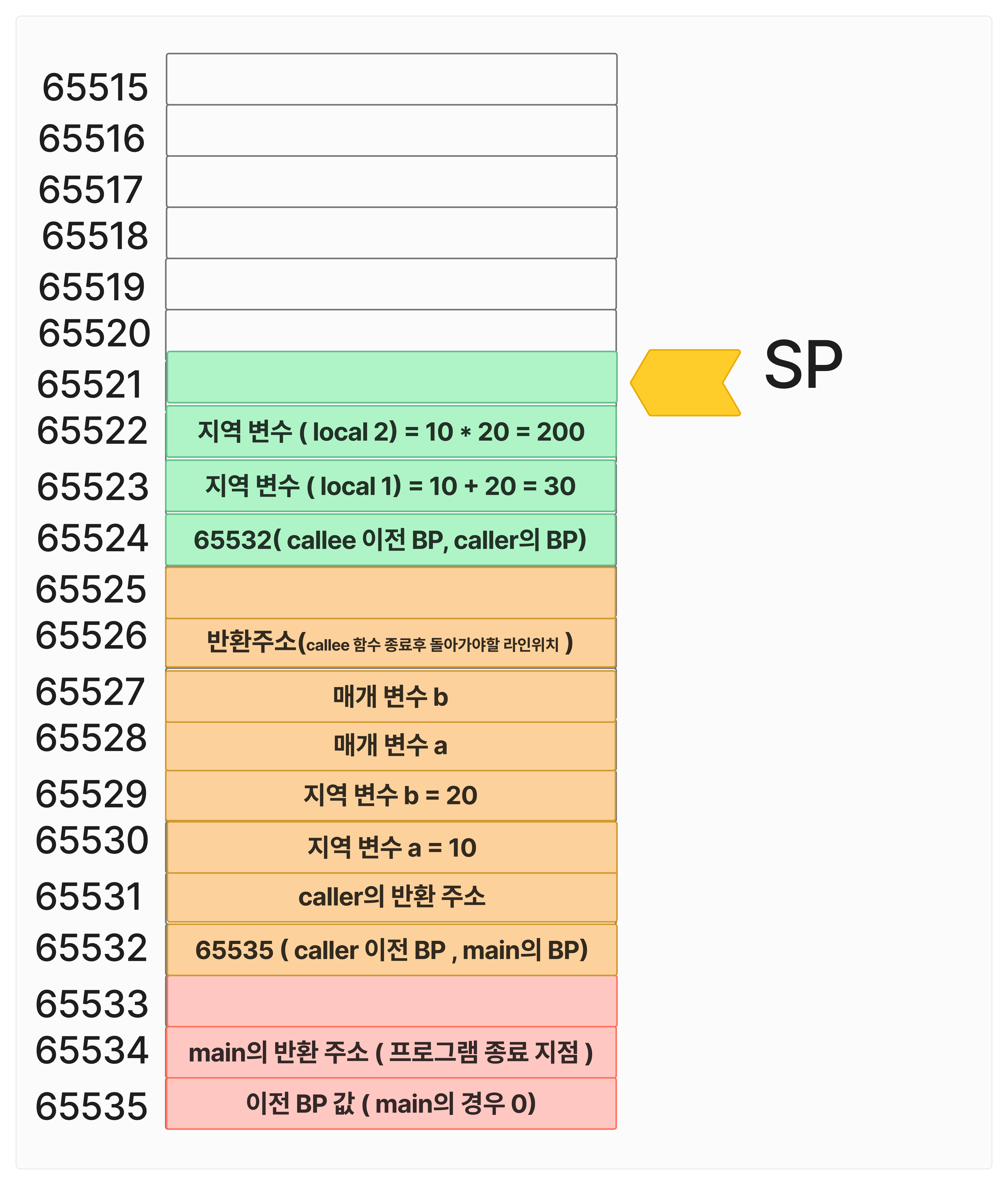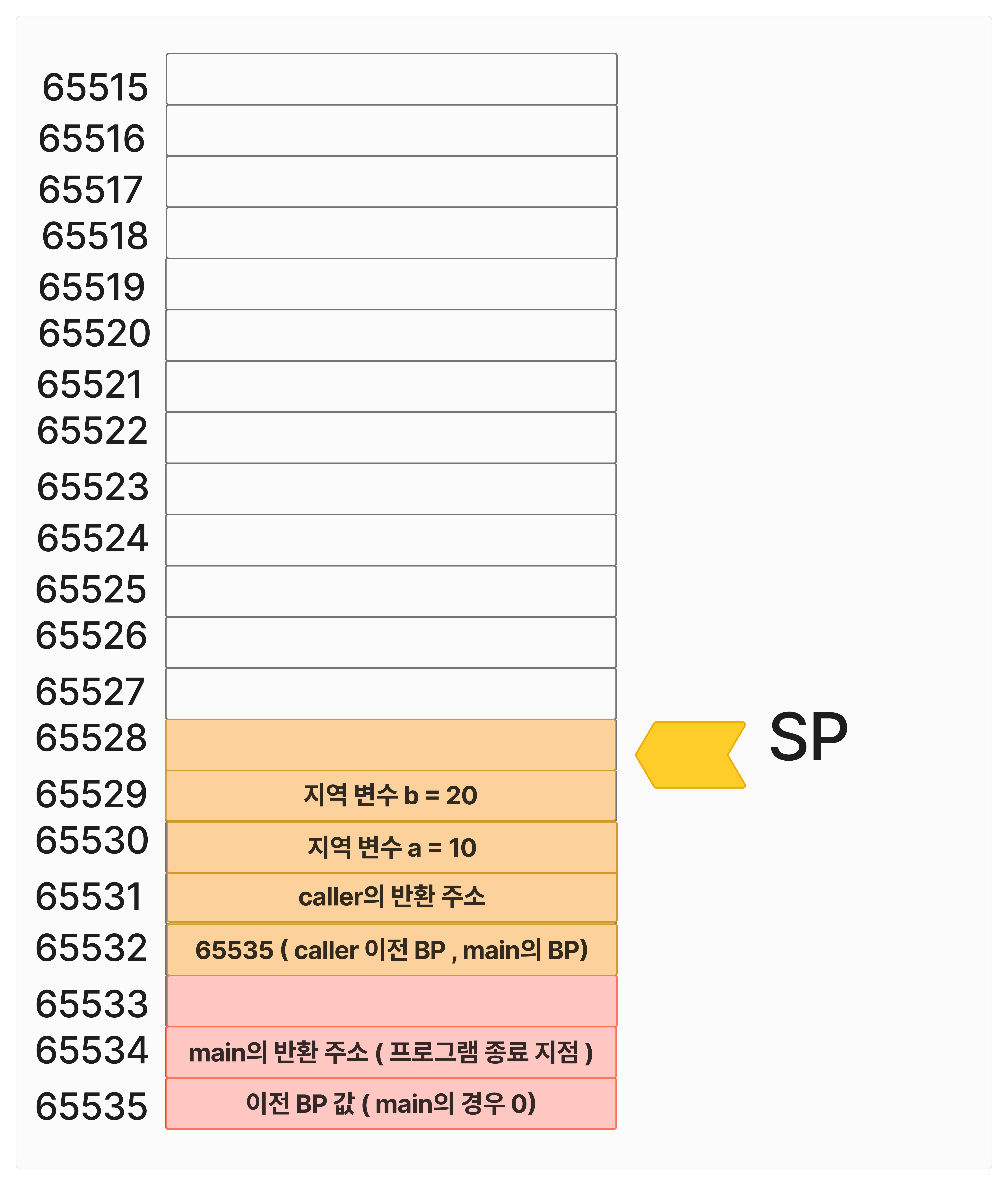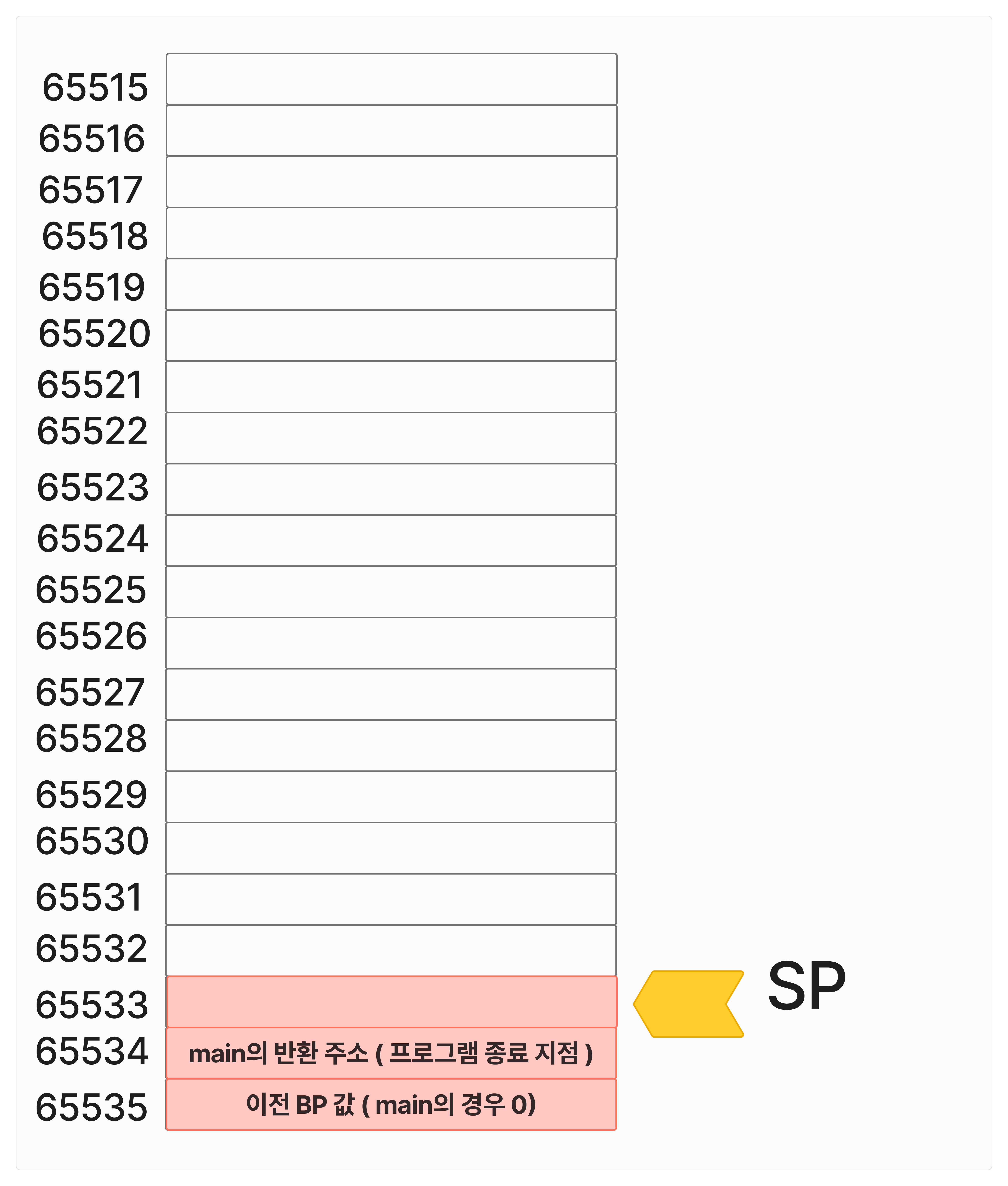 void callee(int x, int y) { int local1 = x + y; int local2 = x * y; } void caller() { int a = 10; int b = 20; callee(a, b); } int main() { caller(); return 0; }1. 프로그램 시작 시점 ( main 함수 진입 전 ) : 이 시점에 스택은 비어있으며, SP와 BP는 동일한 위치를 가리킵니다.