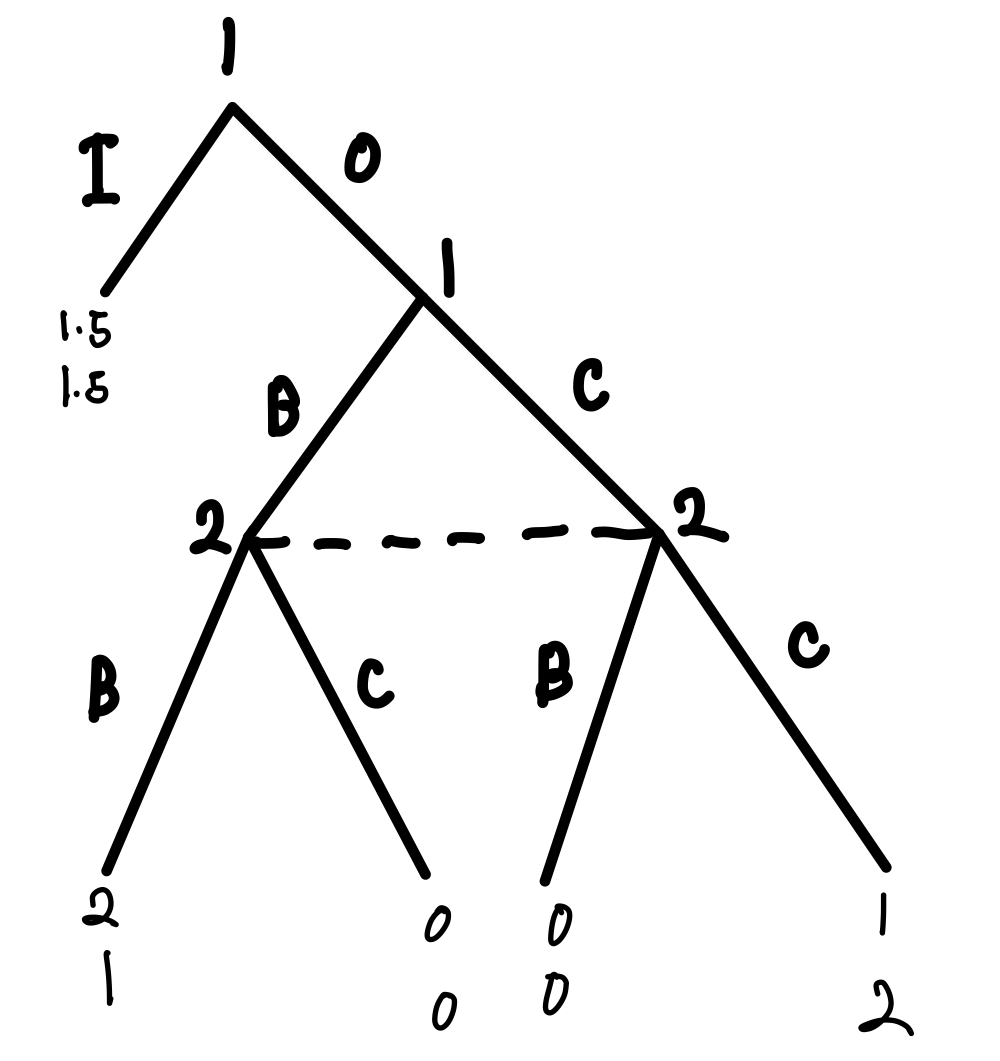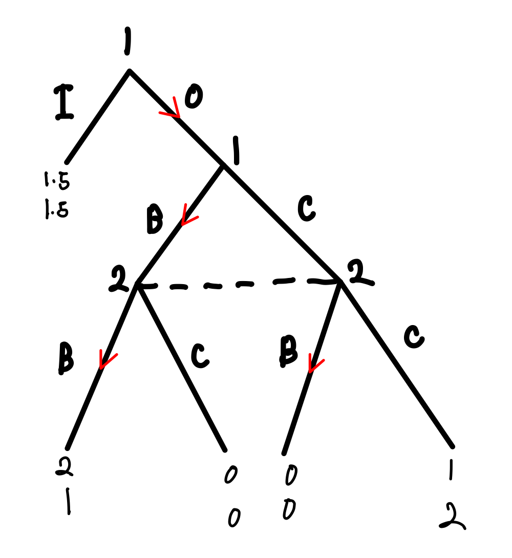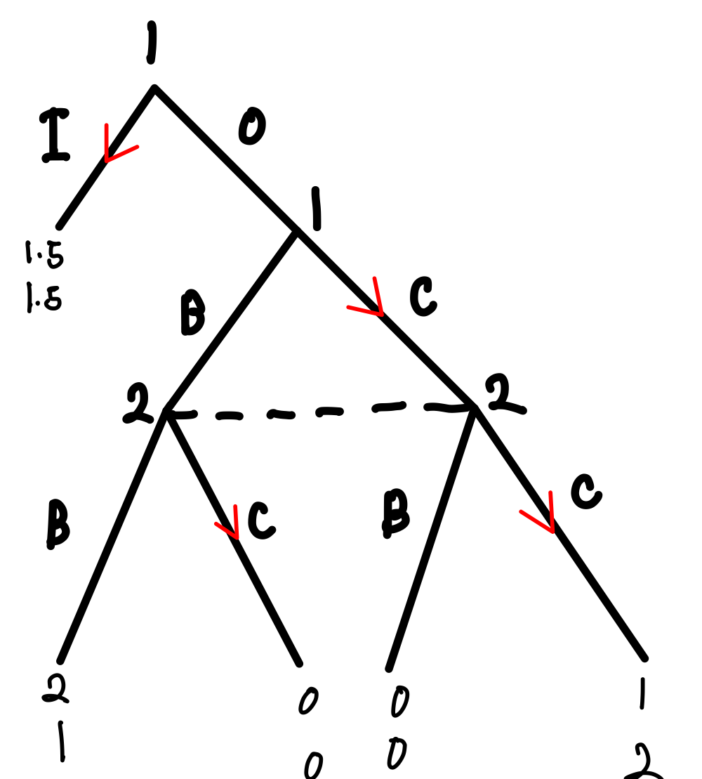 경기자 1이 B를 선택시 받는 보수는 0, C를 선택시 받는 보수는 1이므로 경기자 1은 node 2에서 C를 선택한다.