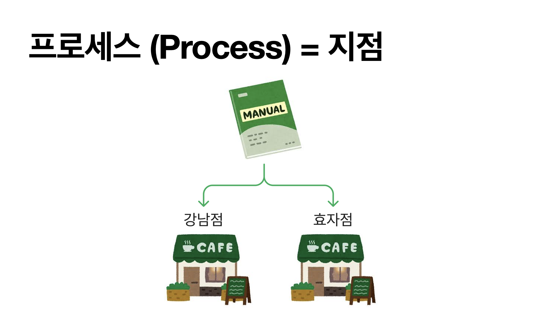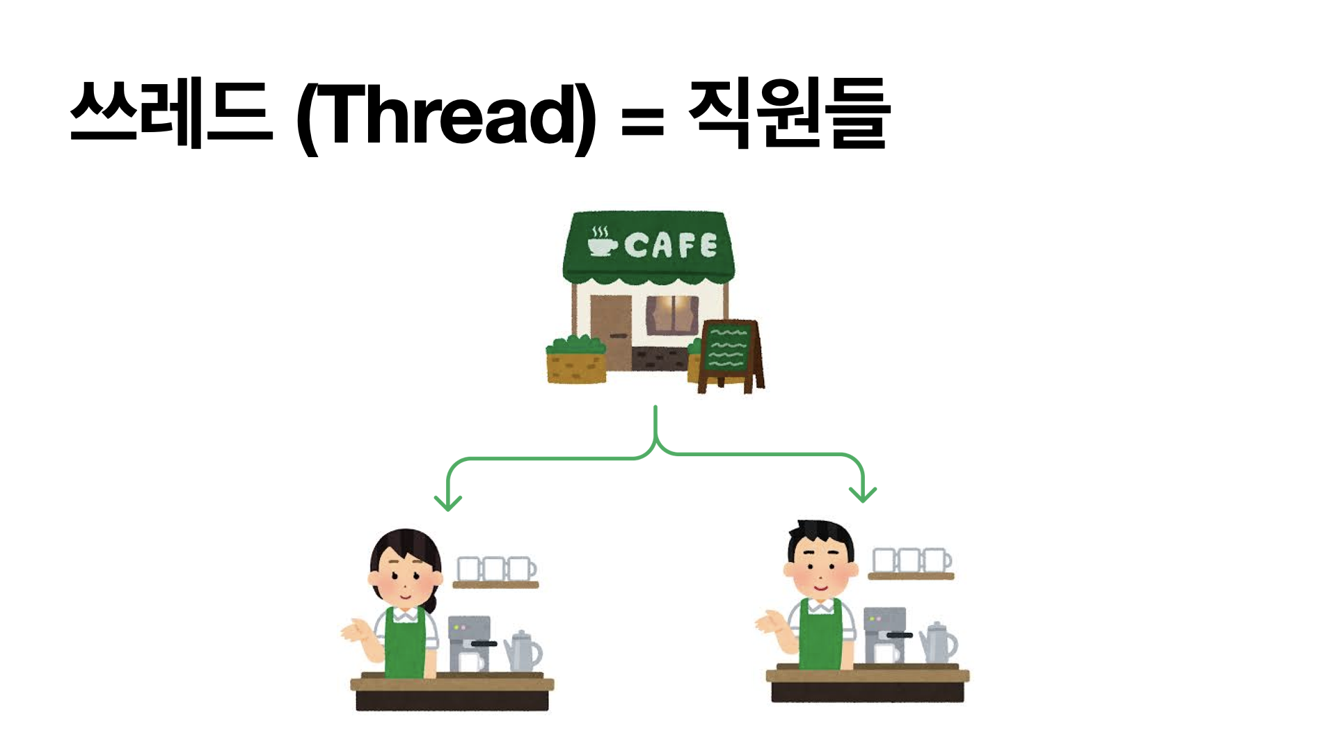 주문 여러개를 동시에 처리하기 위해서 옆에 새로운 카페를 차리기보다는 하나의 카페에 여러 직원을 두는 것이 효율적입니다. 즉 카페 지점에서 일하는 직원들을 쓰레드로 볼 수 있습니다.