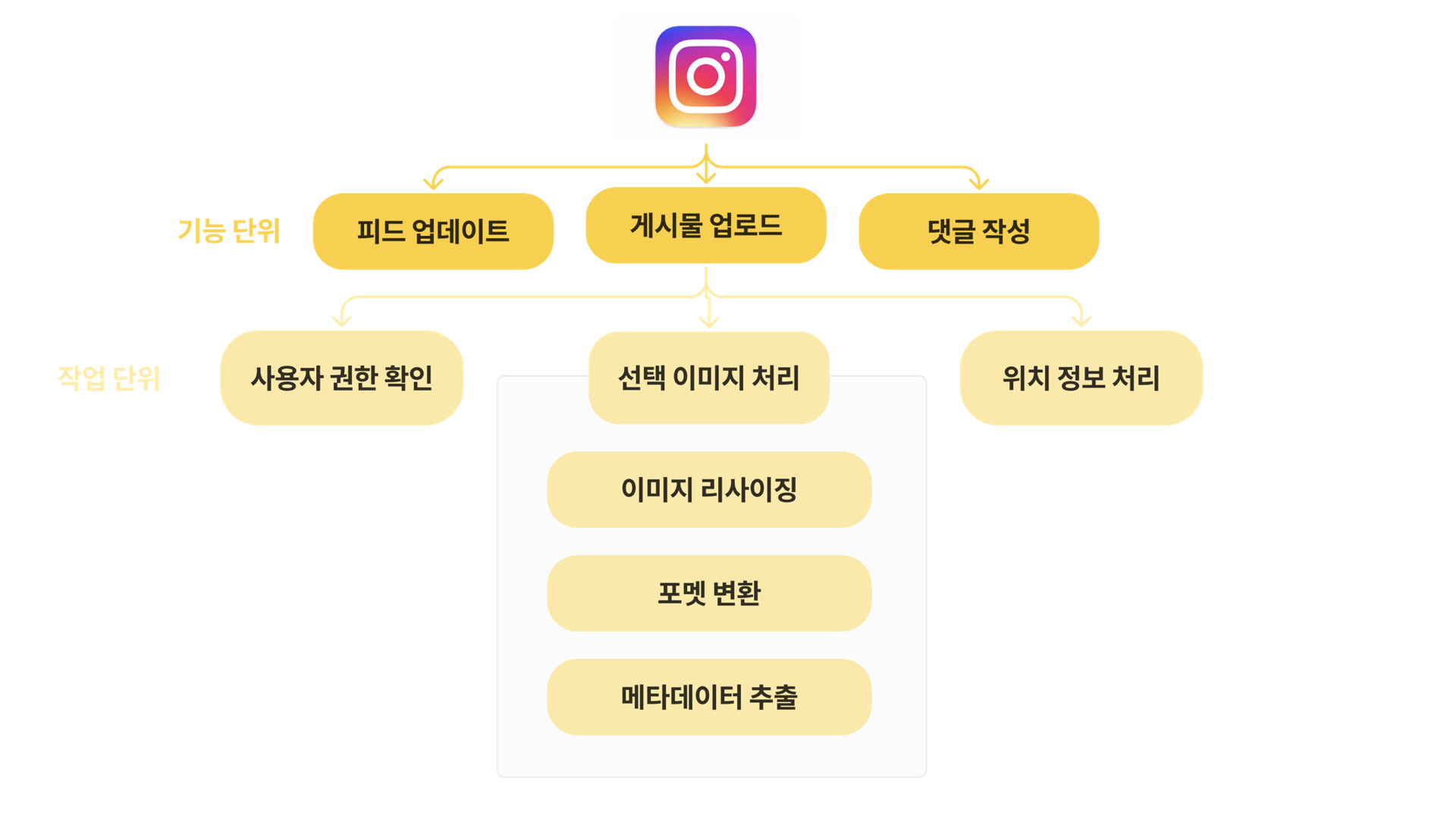 예를 들어 인스타그램에서는 피드 업데이트, 게시물 업로드, 댓글 작성 등의 다양한 기능들이 있고 각 기능들을 수행하기 위한 코드들이 하나이상의 작업으로 묶여 관리됩니다.