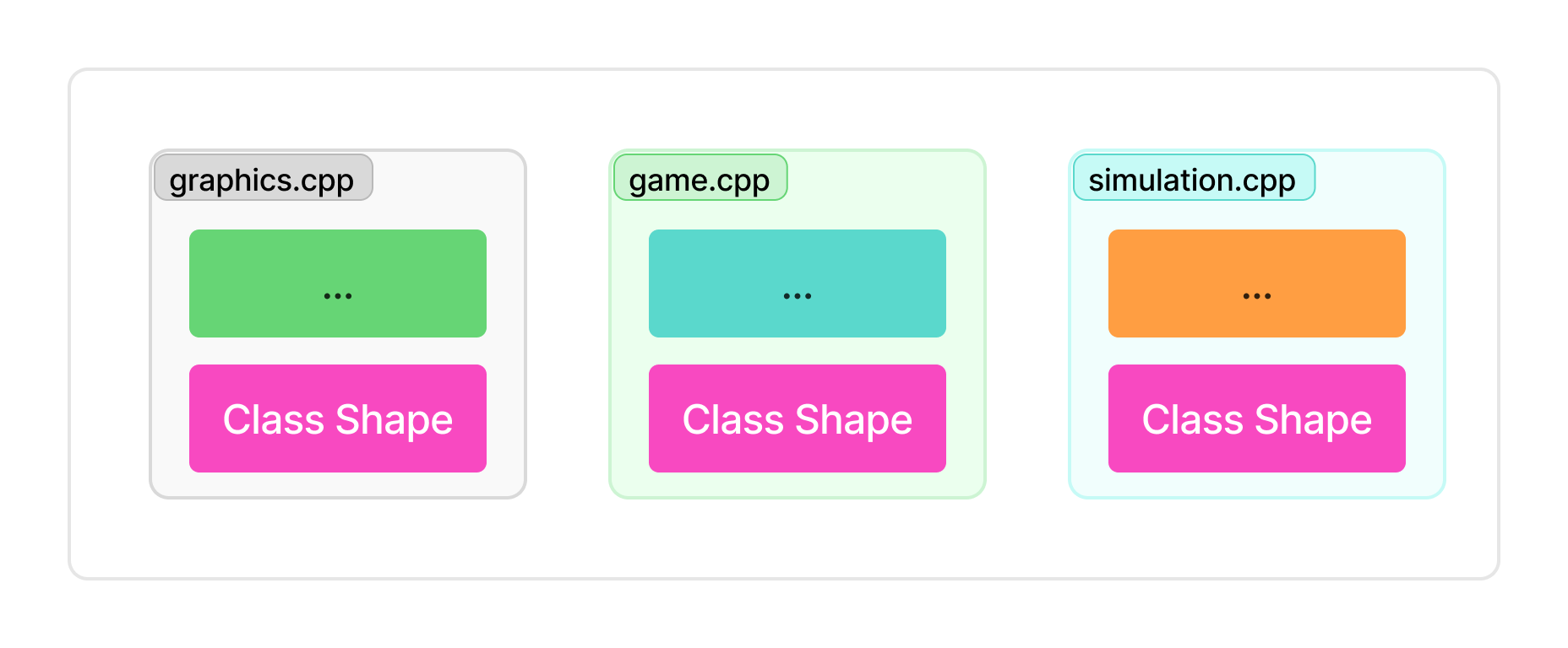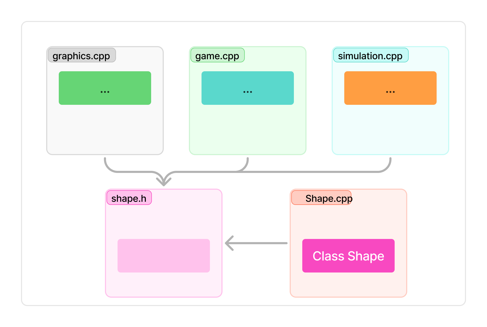 // shape.h #ifndef SHAPE_H #define SHAPE_H class Shape { public: double getCircleArea(double radius); double getRectangleArea(double width, double height); }; #endif // shape.cpp #include "shape.h" double Shape::getCircleArea(double radius) { return 3.14159 * radius * radius; } double Shape::getRectangleArea(double width, double height) { return width * height; } // graphics.cpp #include "shape.h" // Shape 클래스를 바로 사용할 수 있음 // game.cpp #include "shape.h" // 여기서도 동일한 Shape 클래스를 사용 // simulation.cpp #include "shape.h" // 여기서도 동일한 Shape 클래스를 사용이제 π 값을 수정해야 할 때의 과정