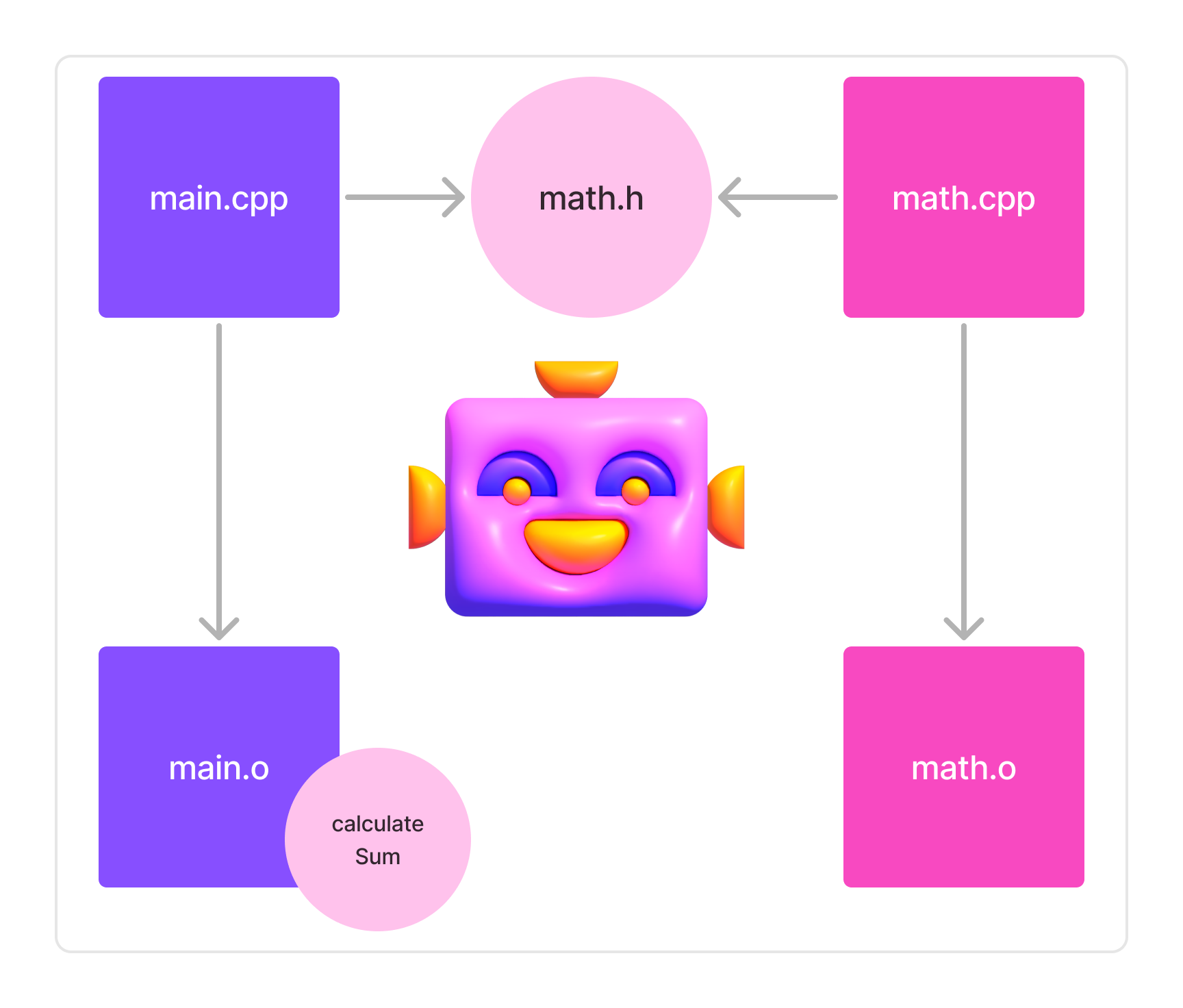 - main.cpp는 오브젝트 파일(main.o)로 컴파일되며, calculateSum 함수 호출 부분에는 "나중에 채워질 공간"이라는 표시가 남습니다.