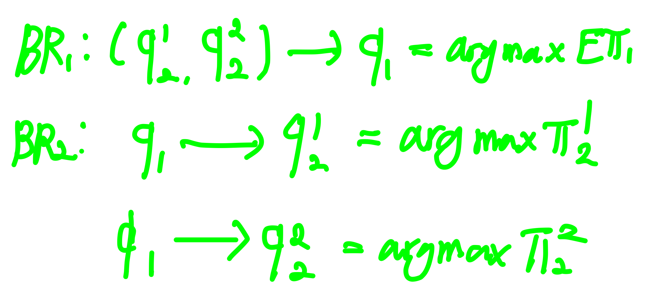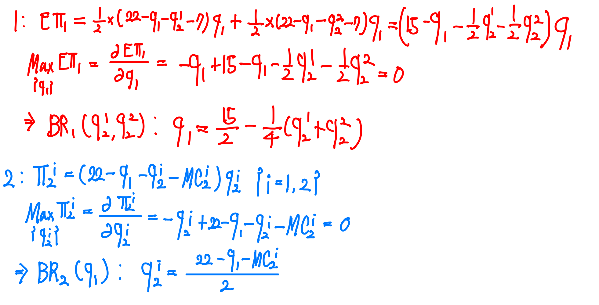 기업 1은 임의의 $q_2^1,q_2^2$가 주어졌을 때 자신의 기대보수 $E\Pi_1$을 극대화하는 것이 목적이다.