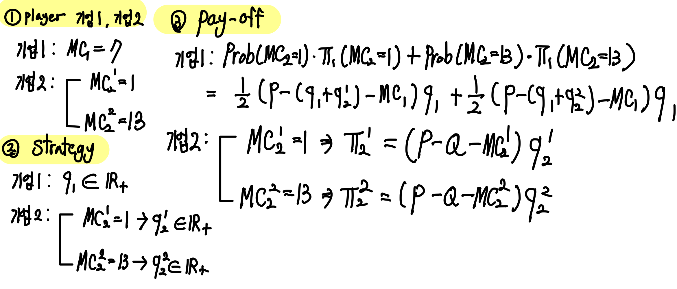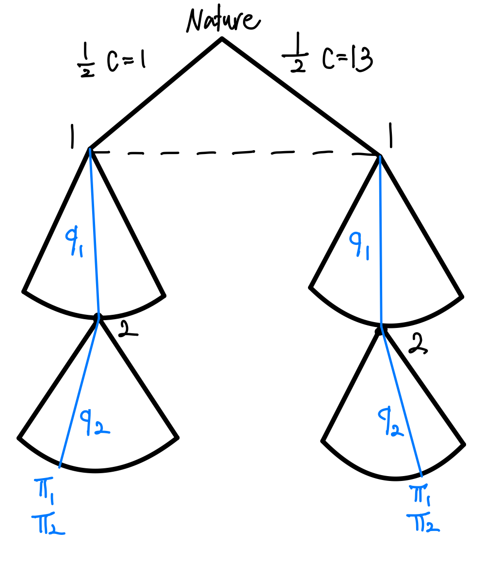-> 기업1이 불완비 정보하에 놓여 있기 때문에 하시니의 자연 개념을 이용하여 확률적으로 상대의 비용구조에 대해서 자연이 결정해주어