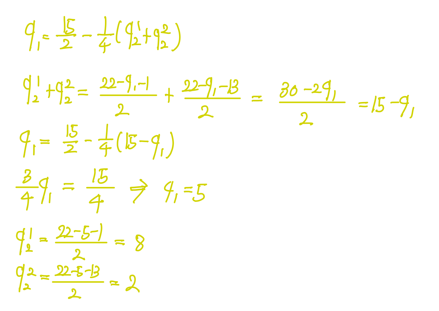 최적대응을 이용하여 구한 위의 세식을 연립하면 균형을 도출할 수 있다.