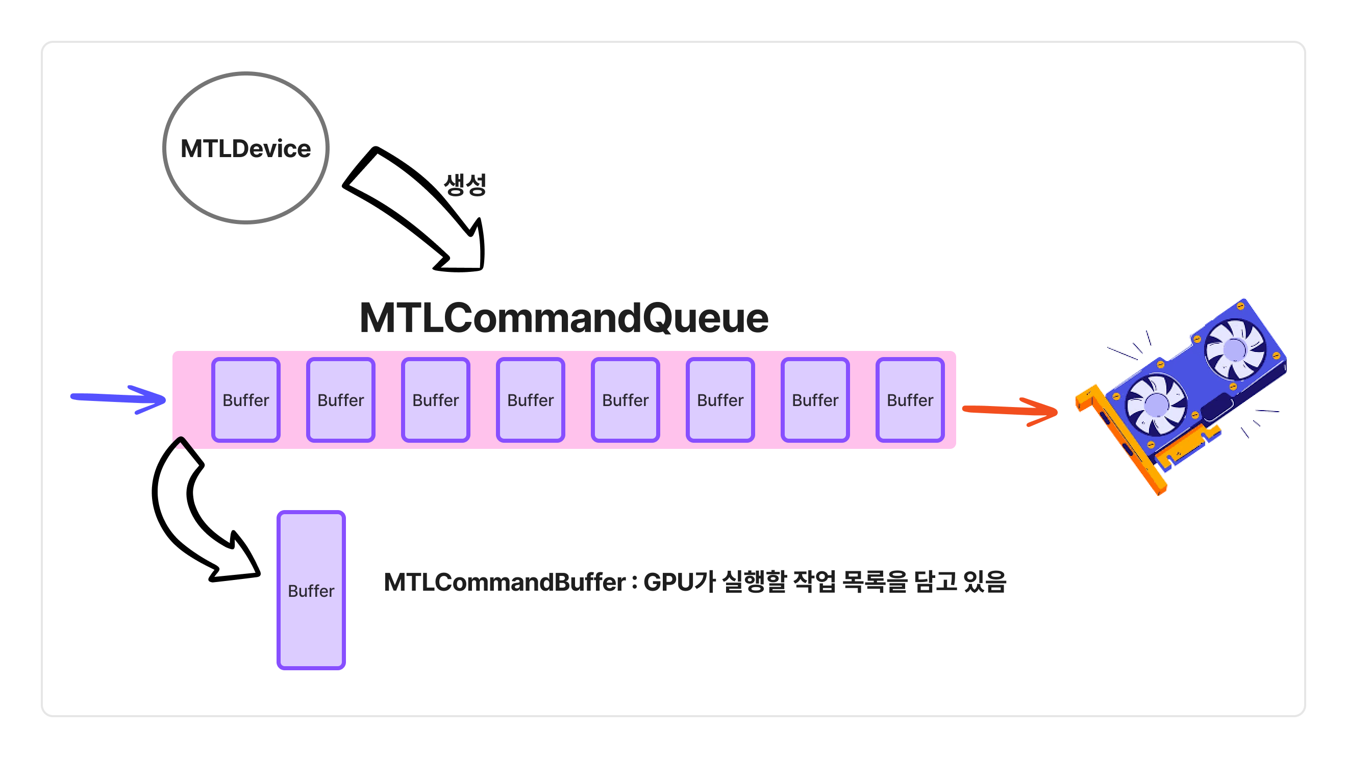 Metal의 모든 작업은 물리적 GPU를 나타내는 MTLDevice 객체를 통해 시작됩니다. 이 디바이스는 명령 큐(MTLCommandQueue)를 생성하며, 이 큐를 통해 GPU에 실행할 명령을 전달합니다.