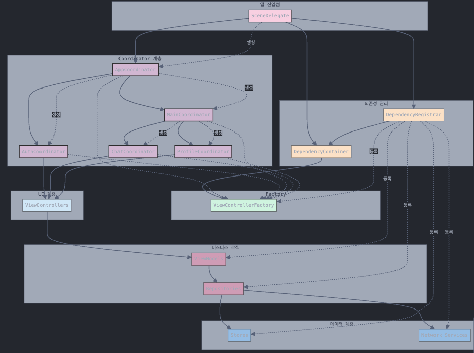 class LoginViewModel { private let userRepository: UserRepository init(userRepository: UserRepository) { self.userRepository = userRepository } } class ChatListViewModel { private let chatRepository: ChatRepository init(chatRepository: ChatRepository) { self.chatRepository = chatRepository } } class ChatDetailViewModel { private let chatRepository: ChatRepository private let messageRepository: MessageRepository init(chatId: String, chatRepository: ChatRepository, messageRepository: MessageRepository) { self.chatRepository = chatRepository self.messageRepository = messageRepository } }뷰모델 계층은 UI 로직과 상태 관리를 담당하며, 리포지토리에 의존합니다. 이 계층 역시 생성자 주입 방식을 통해 의존성을 받습니다.