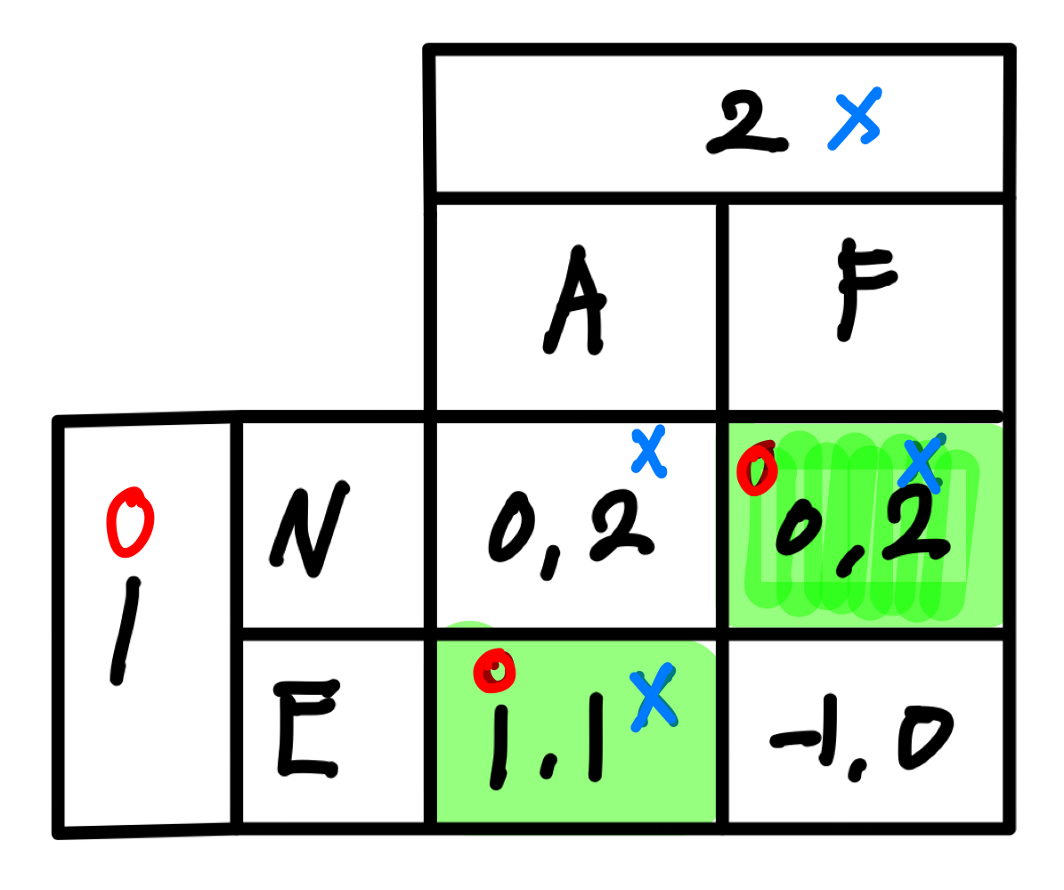 2의 최적대응(X)는 1이 N을 택했을 때 A,F이며, E를 택했을 때는 A이다.