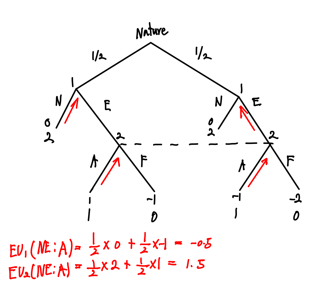 경기자1은 왼쪽 노드에서 경기자2가 A을 할 경우에는 N을 선택시 보수 0보다 E를 선택시 보수 1이 더 크기 때문에 E를 선택한다.