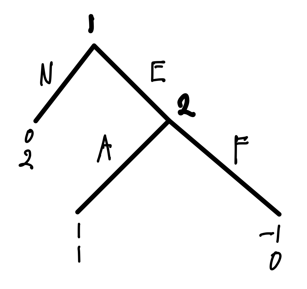 1은 2가 A를 선택할 것을 알고 있다. 때문에 N선택시 얻는 보수 0과 E선택시 2가 A를 선택함으로서 얻는 보수 1을 비교할것이다.