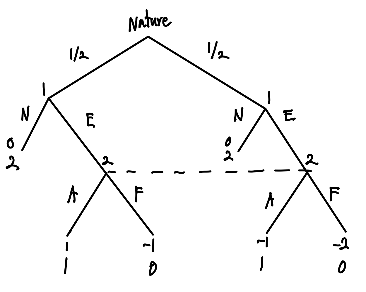 하시니가 도입한 자연 개념을 이용하여 불완비정보가 존재할때의 게임트리를 표현하면 위와 같다.